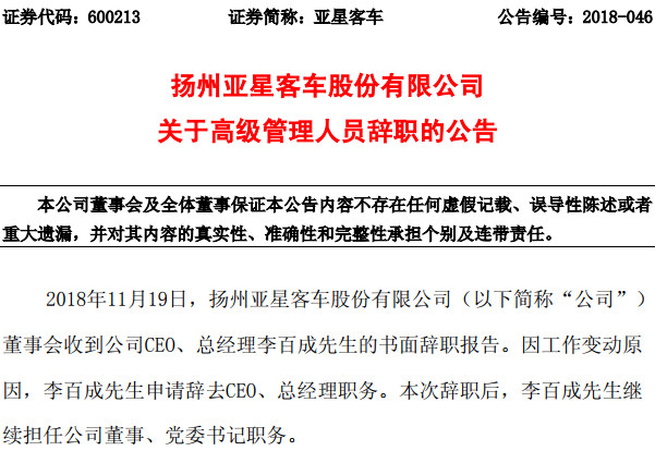 2018年11月19日,亚星客车公司董事会收到公司CEO、总经理李百成先生的书面辞职报告。因工作变动原因,李百成先生申请辞去CEO、总经理职务。本次辞职后,李百成先生继续担任公司董事、党委书记职务。 [详细]