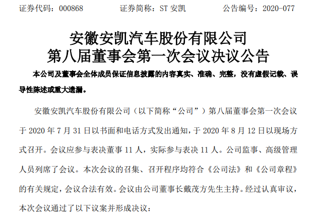 8月13日,安凯客车发布第八届董事会第一次会议决议公告,董事会选举戴茂方先生为公司第八届董事会董事长,选举吴晓东先生为公司第八届董事会副董事长,聘任査保应先生为公司总经理,聘任刘勇先生为公司董事会秘书、公司总会计师、财务财务负责人,聘任赵保军先生、盛夏女士为公司证券事务代表,以上职务任期三年,自董事会通过之日起至第八届董事会届满为止。