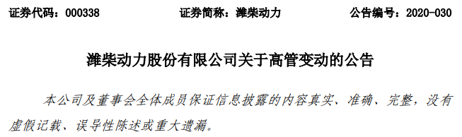 潍柴发布人事变动公告 多位执行总裁、副总裁辞职