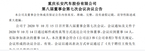 同一天,长安汽车发布公告表示,于10月15日召开第八届董事会第七次会议,会议以通讯表决方式审议通过了《关于聘任王俊先生为公司总裁的议案》。