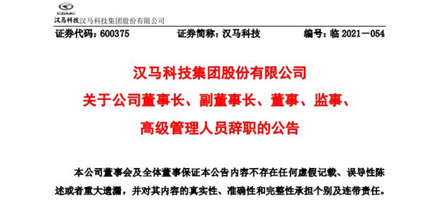 6月1日晚间,汉马科技集团股份有限公司发布关于公司董事长、副董事长、董事、监事、高级管理人员辞职的公告。公告显示,董事会于2021年6月1日收到周建群的书面辞职报告。周建群因工作需要申请辞去公司董事长职务。辞去公司董事长职务后周建群仍担任公司第八届董事会董事、董事会战略委员会主任委员、提名委员会委员职务。