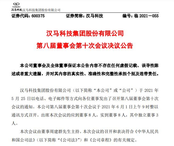6月1日上午9点汉马科技召开了第八届董事会第十次会议,经过与会董事经认真审议,一致通过九项决议,如变更注册资本、修订章程、新增2021年度1.6亿元的日常关联交易、同意周建群辞任董事长、同意刘汉如辞去公司副董事长和总经理职务、同意选举范现军为公司董事长、同意聘任郑志强为公司总经理、增补赵杰为第八届董事会董事候选人等。对于这些决议,6月1日晚间,汉马科技集团股份有限公司发布了第八届董事会第十次会议决议公告。这或许意味着汉马科技领导班子换血完成,将以全新面貌应对未来的机遇与挑战。