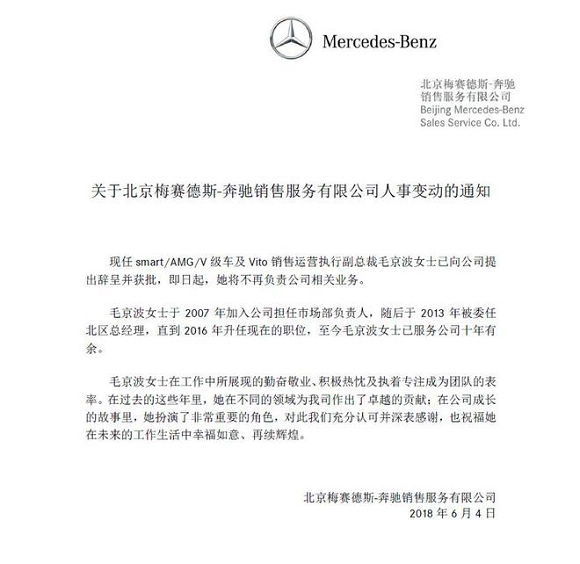6月4日,北京梅赛德斯-奔驰销售服务有限公司宣布了一则重磅的人事调整信息,现任 smart/AMG/V 级车及 Vito 销售运营执行副总裁毛京波女士已向公司提出辞呈并获批,即日起将不再负责公司相关业务。