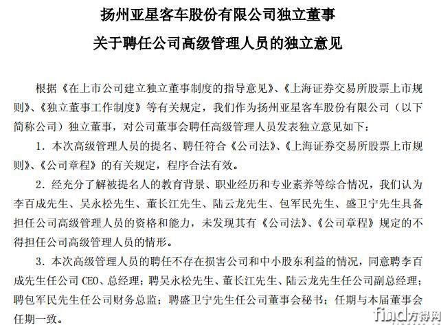 6月27日,扬州亚星客车股份有限公司独立董事发布关于聘任公司高级管理人员的独立意见 。内容中提到,本次高级管理人员的聘任不存在损害公司和中小股东利益的情况,同意聘李百成任公司 CEO、总经理;聘吴永松、董长江、陆云龙任公司副总经理;聘包军民先生任公司财务总监;聘盛卫宁先生任公司董事会秘书;任期与本届董事会任期一致。