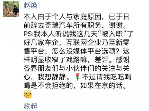 其实,在赵焕本人发布声明之前,其“被离职”的信息已在汽车媒体圈流传开来,甚至有媒体曝出:赵焕即将加盟长城汽车。
