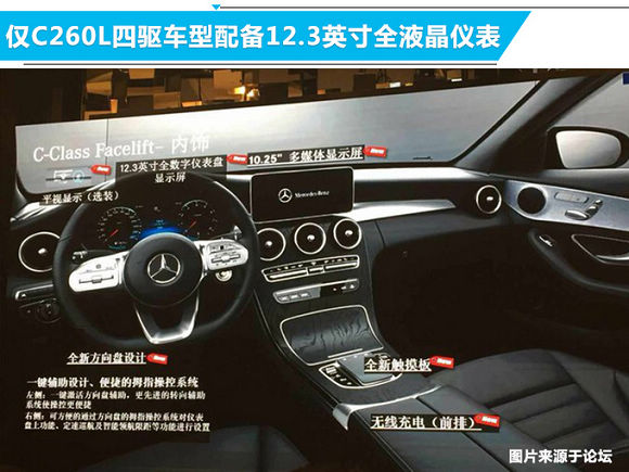 网上车市从梅赛德斯-奔驰经销商处获悉:新款C级将于9月20日开始批量到店,包含180/260/300三个系列。其中C260系列搭新的1.5T发动机+48V轻混动力系统替代了老款2.0T低功率发动机,从数据上看排量降低但动力更足。此外,260系列较200系列配置显著提升,新增12.3英寸全液晶仪表、手机无线充电等。