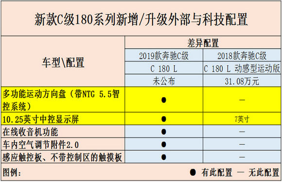 而新款C级的180系列主要升级了带有智控系统的多功能方向盘、10.25英寸中控显示屏以及感应触控板,同时新增在线收音机和车内空气调节两项配置。