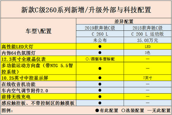 通过奔驰C级新老车型的配置对比可以看出,新款C级260系列的配置提升显著,除带有智控系统的多功能方向盘和10.25英寸中控屏等基础升级外,还升级了高性能LED大灯与64色氛围灯,同时新增前排无线充电配置,而C