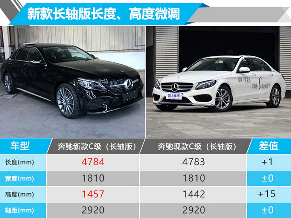 新款C级将提供标轴版与长轴版两种版本车型,并对长度和高度方面做出了不同程度的微调。其中标轴版长宽高分别为4704×1810×1454mm,轴距为2840mm;长轴版长宽高分别为4784×1810×1457mm,轴距为2920mm。