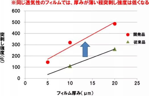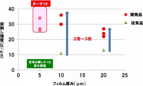 本次研究的产品采用干法双拉工艺,在原有的隔膜产品的基础上进行改良革新,新产品可以维持隔膜原有的绝缘性和离子透过性,材料厚度为由原有产品厚度的20~30微米减少至5微米,单位厚度的穿刺强度提高了2~3倍(图1),理论上可以提高20%的电池容量(图2)。