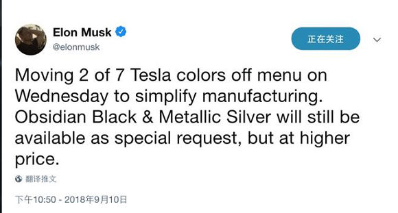 马斯克在推特上表示,“为简化制造流程,将于本周三(9月12日)取消各车型七种颜色中的两种。曜石黑和金属银两款颜色的汽车仍将应特殊要求提供给消费者,但价格会更高。” 剩下各车型可供选择的颜色有纯黑、午夜银、深蓝、珍珠白和红色。