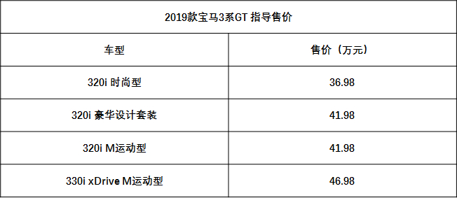 日前,2019款宝马3系GT(参数|询价)车型正式上市。新车共推出了搭载2.0T发动机的共计4款车型,售价区间为36.98-46.98万元,详见下表。相比老款,新车主要针对配置进行了提升,加入了包括专业级导航系统与增强型互联驾驶组合、全液晶仪表盘和Apple