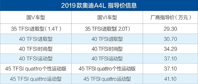 动力部分,2019款奥迪A4L同时提供国V版和国VI版车型,国V排放版本的入门车型35 TFSI进取型继续搭载现有的1.4T发动机,而国VI排放版本的入门车型35 TFSI进取型则首次搭载了超低功率版2.0T发动机,其最大功率为110kW。40 TFSI/45 TFSI车型将继续搭载2.0T发动机,最大功率分别为140kW和185kW,传动系统方面,与发动机匹配的是7速双离合变速箱。