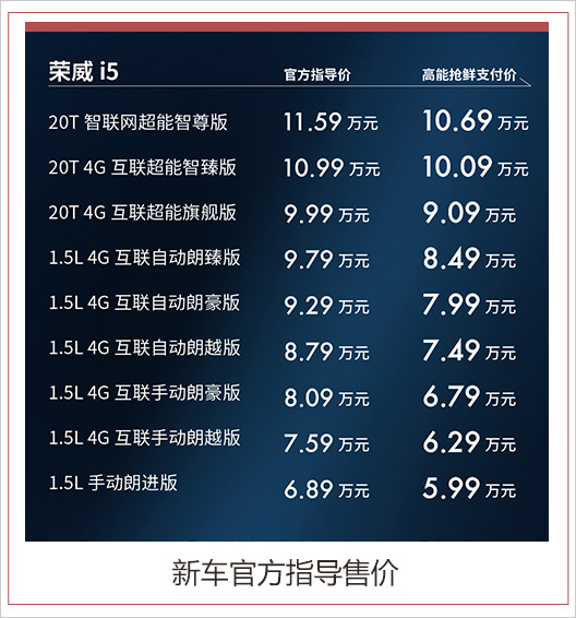 荣威i5是继荣威i6之后又一款全新家用轿车,于今年9月正式亮相。10月26日,网通社从上汽乘用车官方获悉,荣威i5正式上市,共推出9款车型,官方指导售价6.89-11.59万元。另外官方宣布,凡在2018年12月31日前购买荣威i5的用户,可享受9,000-13,000元现金优惠,新车的高能抢鲜支付价区间为5.99-10.69万元。