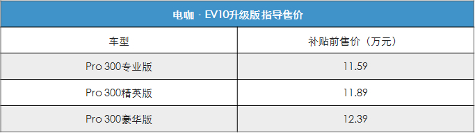 日前,我们从电咖汽车官方获悉,电咖·EV10 Pro 300正式上市,新车共推出3款车型,补贴前指导价格区间为11.59-12.39万元。新车最大的亮点在于续航里程的提升,详情请见下表: