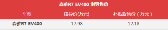 一汽吉林森雅R7 EV400上市 补贴后售12.18万/NEDC续航3