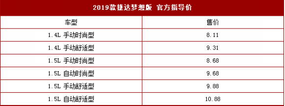 2019款一汽-大众捷达梦想版车型正式上市,新车共推出2种动力共6款车型,售价区间为8.11-10.88万元。