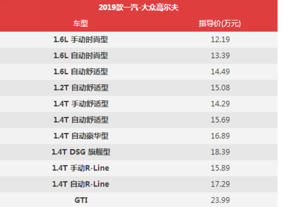 一汽-大众2019年款高尔夫正式上市,新款高尔夫售价区间是12.19万-18.39万,新款高尔夫R-Line售价区间是15.89万-17.29万,新款高尔夫GTI售价是23.99万元。