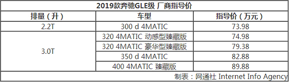 奔驰全新一代GLE已经发布,但尚未引入国内,新年临近,现款GLE迎来换新。网通社从梅赛德斯-奔驰官方获悉:2019款GLE正式上市,售价73.98-89.88万元。新车与2018款车型相比售价保持不变,配置进行了小幅度升级,共推出的5款车型中,并未包括搭载4.0T