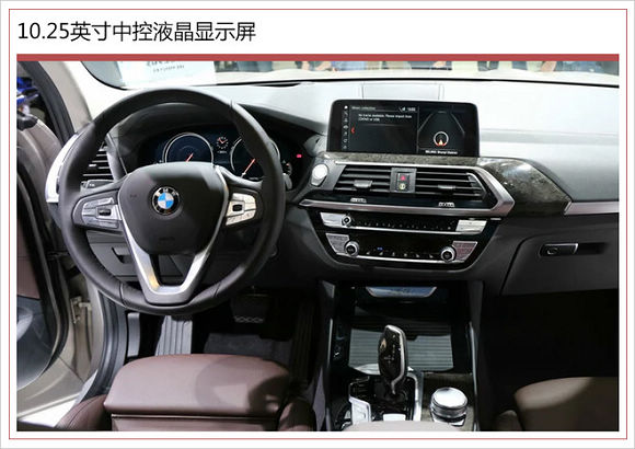 华晨宝马全新X3内饰采用Sensatec皮革包裹,三辐式多功能方向盘前方为12.3英寸TFT LCD液晶仪表;中控区域整体偏向驾驶员一侧,空调出风口上方为10.25英寸悬浮式触控液晶显示屏,底部空调控制旋钮/按键周围带有镀铬饰条装饰,更显精致。