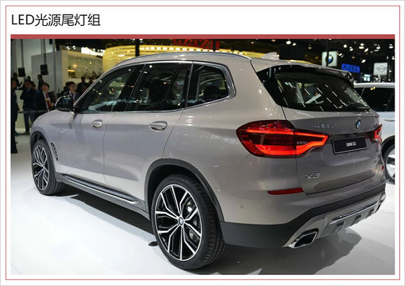 华晨宝马全新X3侧面线条立体感强烈,同时侧窗周围加入镀铬饰条点缀,整体更显精致;尾部造型棱角分明,两侧尾灯组内部进行调整并加入LED光源,搭配尾窗上沿高位刹车灯,点亮效果十分醒目。新车底部护板采用与车身不同材质设计,配以下方双边共两出矩形尾排,为整车增加运动气息。