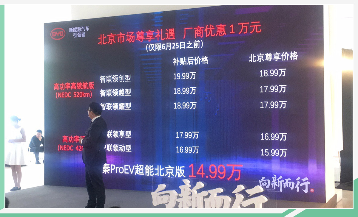 秦Pro EV是比亚迪旗下紧凑型纯电动轿车,5月16日,基于该车打造的长续航版车型——秦Pro EV超能版正式上市。从比亚迪官方获悉,秦Pro EV超能版的补贴后售价为16.99-19.99万元,北京地区6月25日前额外享受厂家优惠1万元。此次推出的超能版车型分为续航420公里和520公里版本,搭载了L2级智能驾驶,并拥有多项主动安全配置。此外,专为北京市场推出的秦Pro EV超能北京版售价为14.99万元,续航里程401公里。