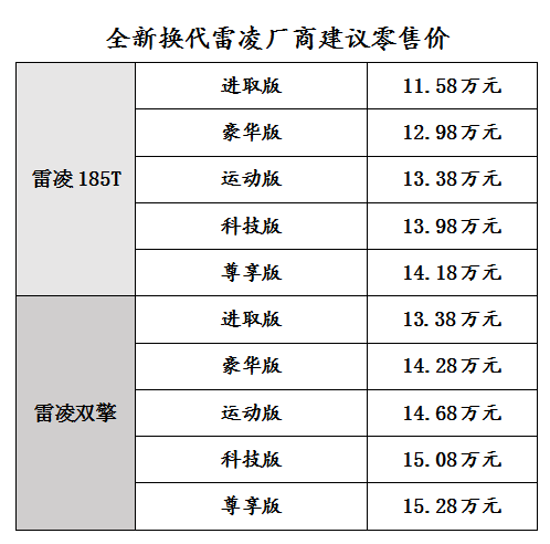 全新换代雷凌185T和双擎都各有5大配置版本。雷凌185T在入门版车型就标配模拟10速CVT变速箱、前后独立悬架、车联网、8个SRS空气囊、LED大灯及LED组合尾灯、EPB电子驻车系统、四门车窗一键升降以及16英寸铝合金轮毂等高价值配置,在大幅提升价值的同时,指导价相比现款下调了4000元。同时,混合动力更加触手可及,双擎进取版相比现款价格下调了6000元。核心等级185T豪华版和双擎豪华版,都搭载了最新一代Toyota