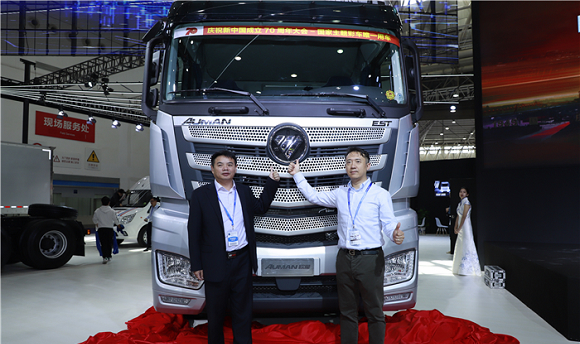 福田汽车集团品牌副总裁、福田戴姆勒汽车品牌战略总监李健与福田戴姆勒汽车营销公司鄂赣分公司总经理程志坚共同揭幕欧曼超级重卡国典版