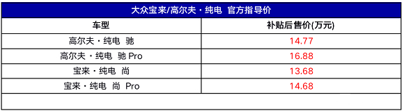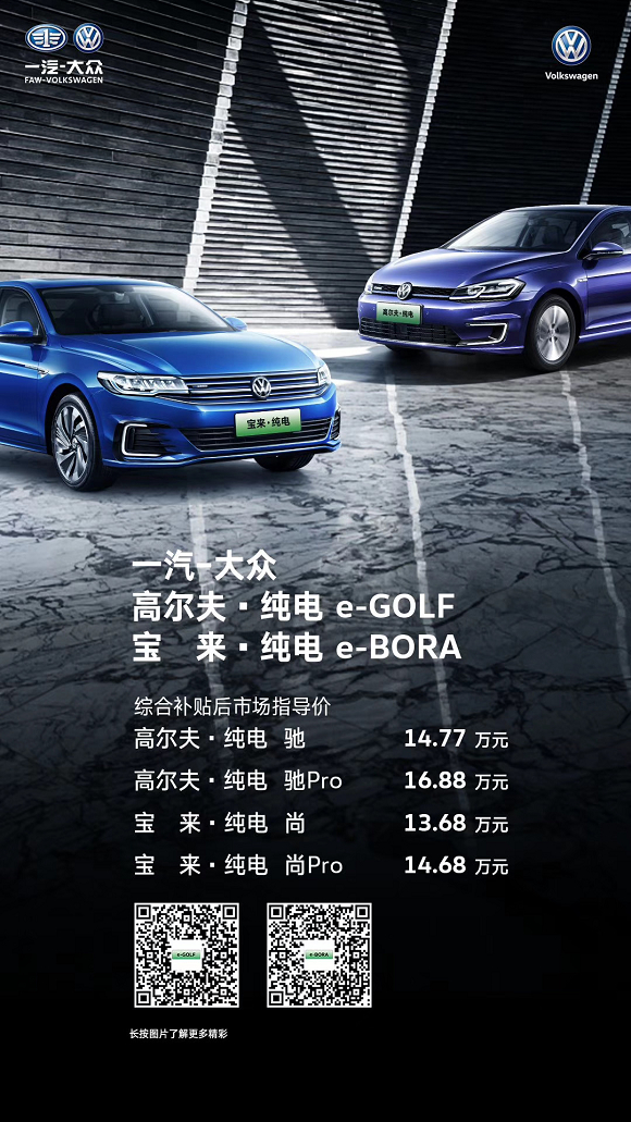 10月29日,一汽-大众高尔夫·纯电和宝来·纯电正式上市。其中,高尔夫·纯电提供驰、驰Pro两款车型,综合补贴后市场指导价分别为14.77、16.88万元;宝来·纯电提供尚、尚Pro两款车型,综合补贴后市场指导价分别为13.68、14.68万元。