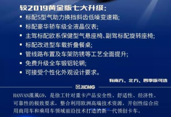 历经三年锤炼,对该款至臻成熟的旗舰车型,徐工重卡再次重磅升级,在2019“金色年华纪念版” 基础上,推出2020升级版“G9-550硬漢”,保持上述高端标配的同时,实施多项升级:标配S型气助力换挡斜齿低噪变速箱、主驾欧系保健型气悬座椅、副驾旋转座椅、全液晶仪表、管线路布置及车架防锈等工艺全面提升,有南方、北方、四季版可选,并可接受外观个性化设计。