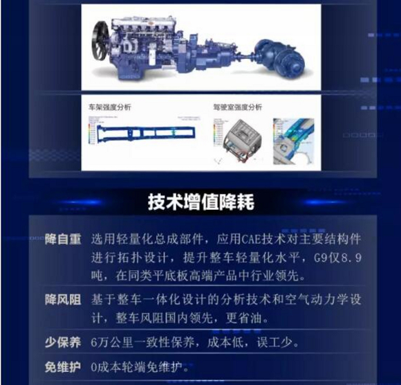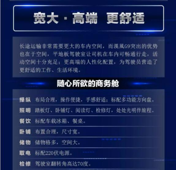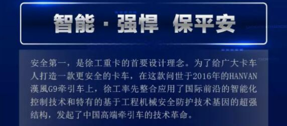 漢風G9于2016年上市,是徐工重卡“让卡车更美好”的开山之作,颠覆传统设计理念,突出安全、豪华、舒适、智能化,率先应用HUD、LDWS、FCWS、TPMS、ASR、CCS等先进技术,采用平地板结构,标配冰箱、餐桌、逆变器、多功能方向盘、定速巡航、中控锁、LED日行灯、电调节电加热后视镜等诸多人性化设计。“鲶鱼”的介入,引发新一轮行业技术革命。