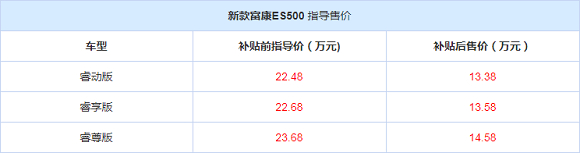 [汽车之家 新车上市] 日前,我们从东风富康官方了解到,新款ES500正式上市,其共推出三款配置车型,补贴前售价区间为22.48-23.68万元,综合补贴后售价区间为13.38-14.58万元。其定位为紧凑型纯电动轿车,NEDC工况续航里程为401km。关于详细售价,见下表: