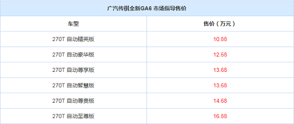 动力方面,全新GA6 270T车型搭载4A15J1型1.5T直列四缸发动机,最大功率169马力,峰值扭矩265牛·米,满足国六排放标准,传动系统匹配6速手自一体变速箱。