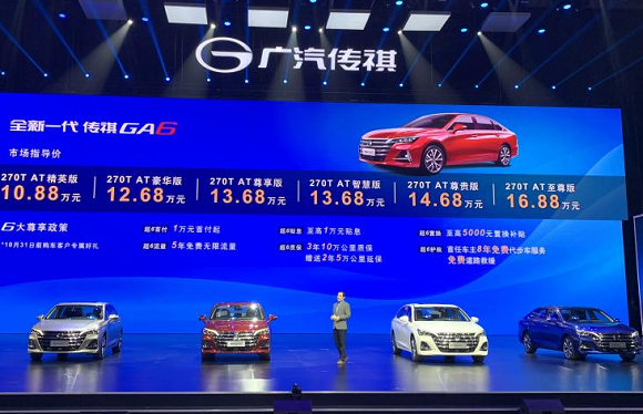 [汽车之家 新车上市] 8月23日晚,广汽传祺正式公布了全新一代GA6车型的售价,新车搭载1.5T发动机(四缸),共推出6款车型,售价区间为10.88-16.88万元。作为GA6的换代车型,广汽传祺5年磨一剑,全新GA6在外观、内饰、配置等多方面都进行了全面的升级。此外,10月31日前新购车的用户还将享受包括5000元置换补贴、5年免费无限流量在内的6大尊享政策。
