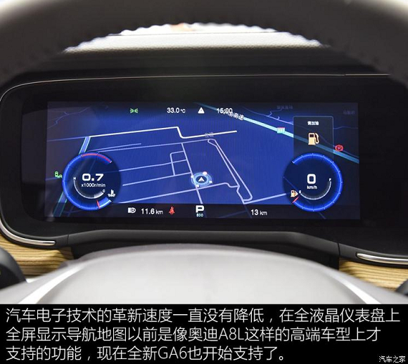 内饰部分,全新GA6提供米色和黑色两种配色,兼顾优雅和品质感。中控台上夺人眼球的连体双屏设计是时下的潮流,12.3英寸液晶仪表显示效果细腻,将车内科技感进行了提高。而同为12.3英寸的中控屏则内置了传祺祺云智能系统作为车机。