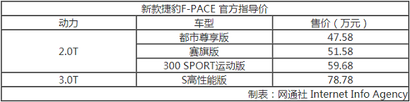 F-PACE是捷豹旗下轿跑SUV,搭载2.0T和3.0L机械增压发动机。9月4日,网通社从捷豹路虎官方获悉,新款F-PACE正式上市,共推出4款车型,官方指导价为47.58-78.78万元。新车推出全新赛旗版车型,为纪念捷豹XK120跑车诞生70周年打造,配备了运动套件与专属标识。
