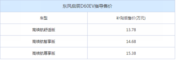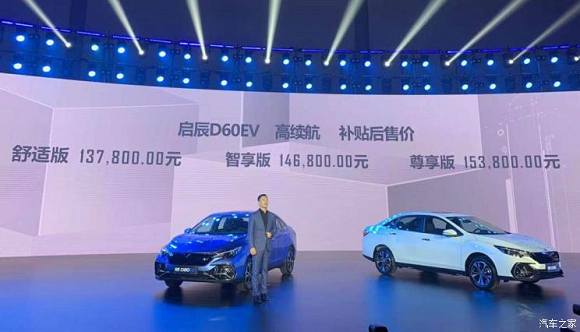 9月2日晚东风启辰旗下的启辰D60EV正式上市,新车共推出3款车型,售价区间在13.78-15.38万元之间。该车搭载容量为58kWh的三元锂电池组,续航里程(NEDC标准下)为481km。