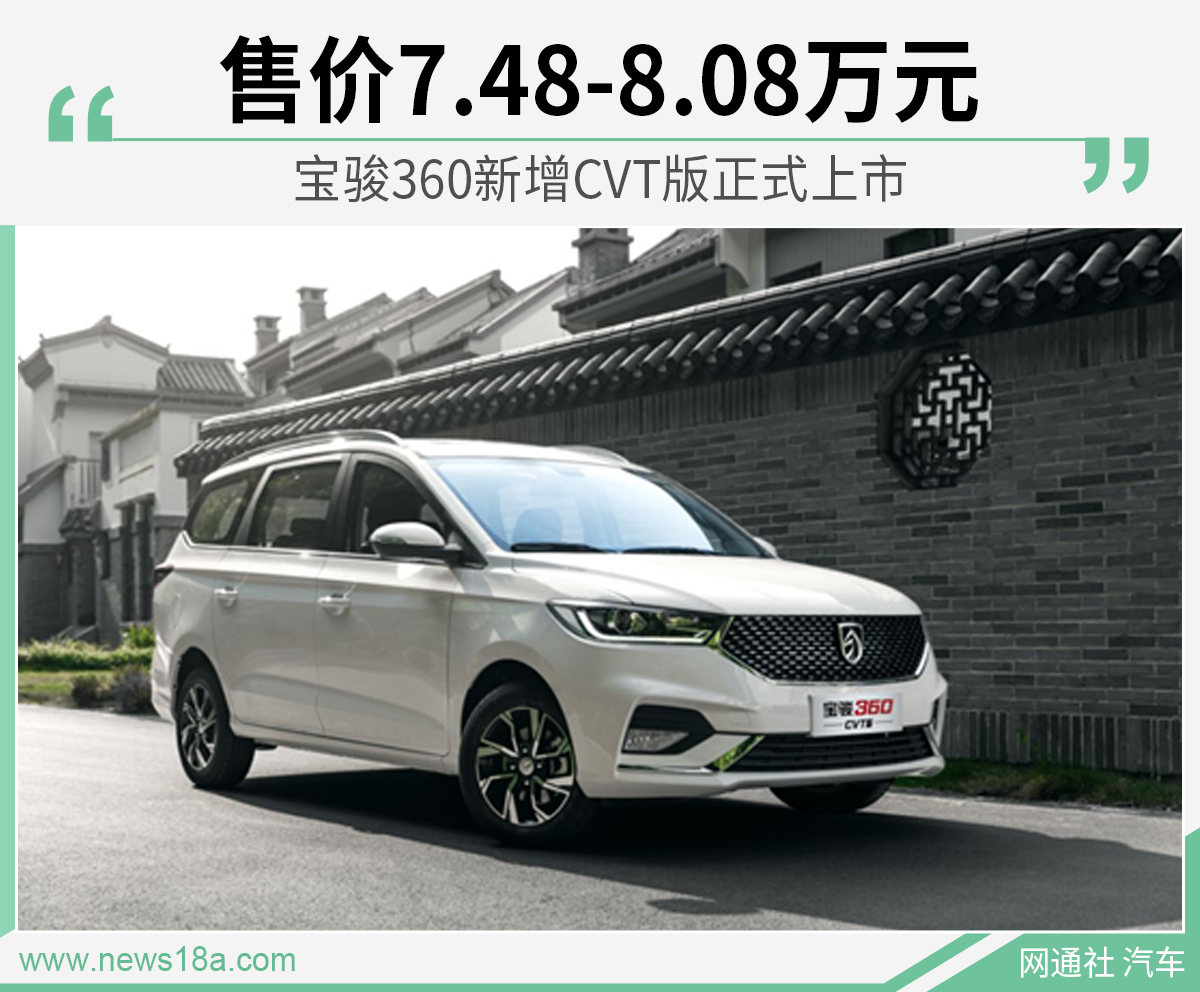 宝骏360是上汽通用五菱旗下的6座家用MPV车型,目前在售车型匹配6挡手动或5挡AMT变速箱,售价区间为5.68-7.58万元。9月26日,网通社从上汽通用五菱官方获悉,宝骏360CVT版正式上市,售价7.48-8.08万元。新车搭载1.5L升自然吸气发动机,匹配与博世联合开发的CVT变速箱。