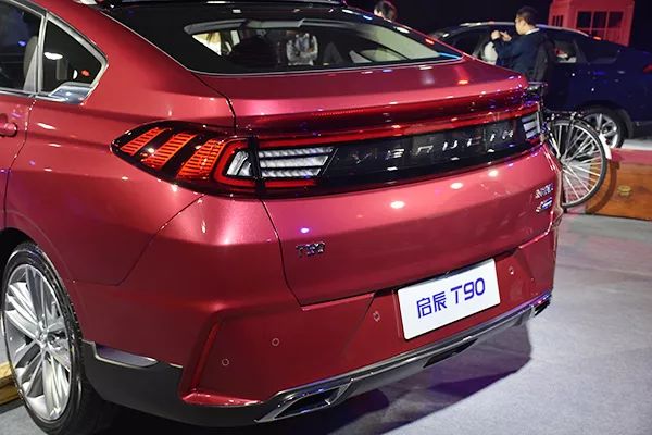 来到车尾,新款启辰T90采用了时下流行的贯穿式尾灯设计,由82颗LED光源组成的贯穿式光导尾灯,在刹车、倒车时会显示出不同的发光效果,相对好看。另外,新车还搭配了一米长的LED高位刹车灯,它与后挡风玻璃融为一体,颇有设计感。