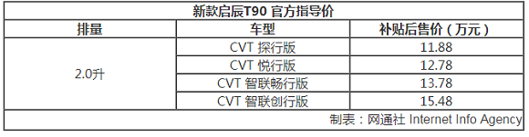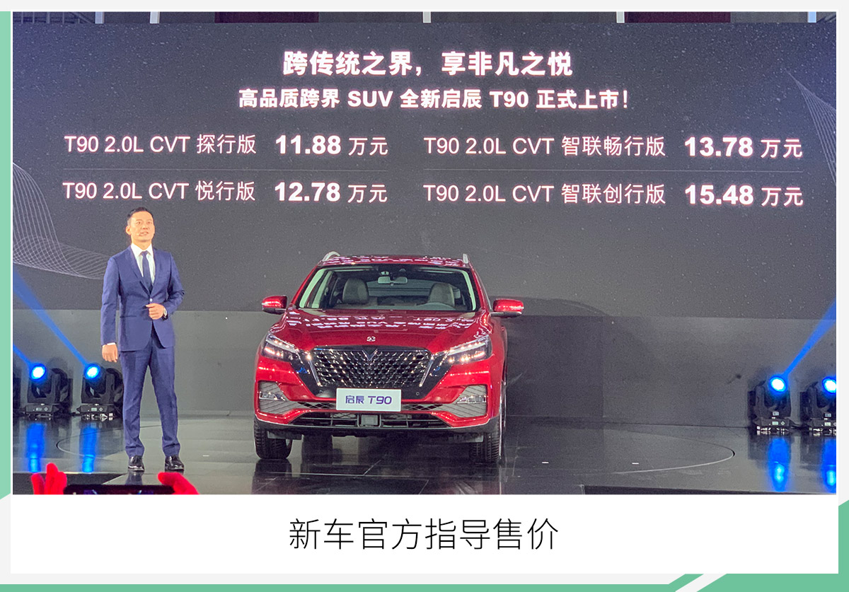 T90是东风启辰旗下一款中型轿跑SUV,于2016年12月进入市场。9月25日,网通社从东风启辰官方获悉,T90中期改款车型正式上市,推出4款车型,官方指导售价区间为11.88-15.48万元。新车外观方面有所调整,前脸换装全新样式的点阵式进气格栅,内饰部分也进行了升级,包括提供全液晶仪表,升级后的车载智联系统、智能驾驶辅助系统等。