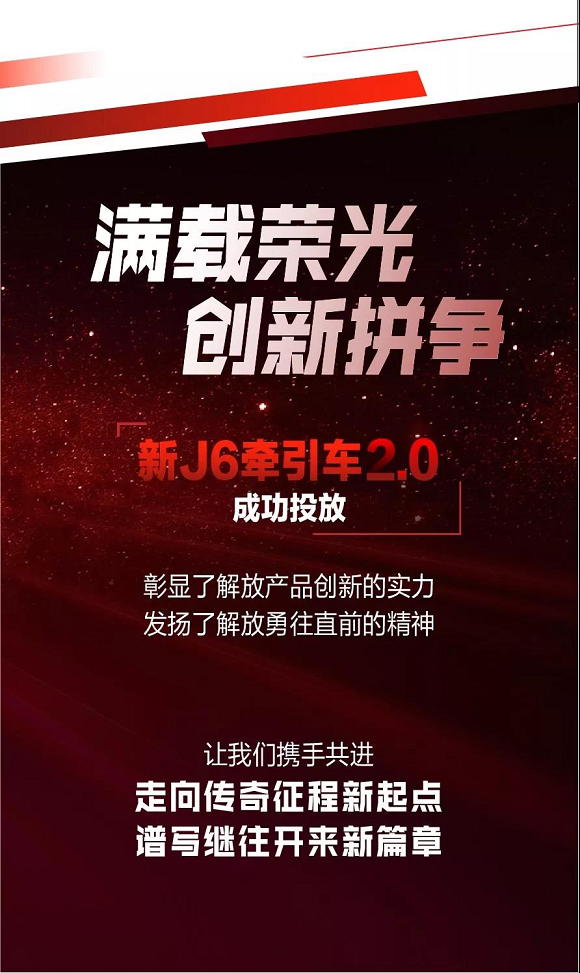 一汽解放总经理助理、销售公司总经理王志才在会上表示:新J6牵引2.0产品将凭借卓越的产品力,站在国内卡车行业的顶峰,成为一汽解放的又一个传奇。面对未来,一汽解放初心不改,将以奋进之姿继续研发新技术、优化新产品,致力于打造最值得骄傲的商用车企业、最值得信赖的商用车品牌;一汽解放将秉承“信而有征、智勇双全、益行天下”的品牌理念,携手广大用户,共同奠定中国卡车新格局、书写新速度、追逐新未来,向着“中国第一,世界一流”的战略目标不断奋进。