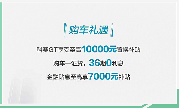 配置方面,科赛GT提供有7英寸全液晶仪表、10.3英寸触控屏、自适应巡航、360°全景影像、GPS导航、车载蓝牙、车载4G网络、无线充电、行车记录仪、胎压监测、座椅通风/加热等,并全系标配可开启的全景天窗,十分丰富。