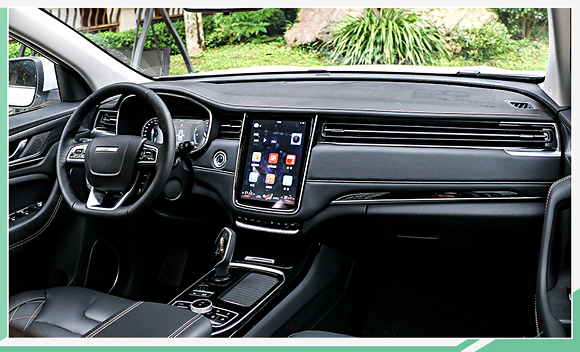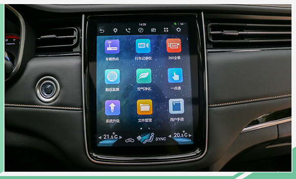 新车内饰采用大面积软质材料包裹,配以大量银色装饰点缀,整体更显精致。平底多功能方向盘较为粗犷,且加入真皮材质进行包裹;中控区域整体造型较为简洁,中间大尺寸屏幕格外醒目。上方为贯穿式空调出风口,且中间带有镀铬饰条点缀,整体更加气派;此外,新车下方钢琴样式的空调控制按键造型十分新颖。