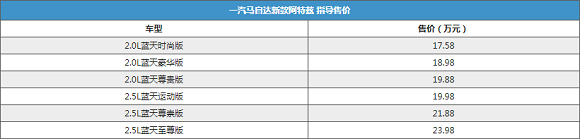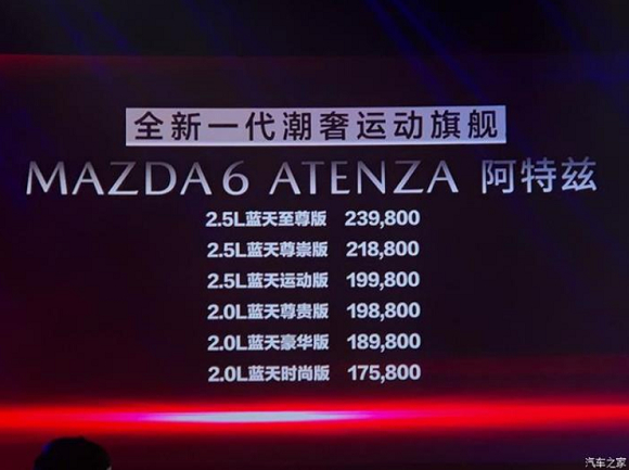 8月20日,一汽马自达新款阿特兹(参数|询价)正式上市。新车共推出6款车型,指导价格区间为17.58-23.98万元。详情请见下图: