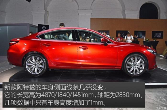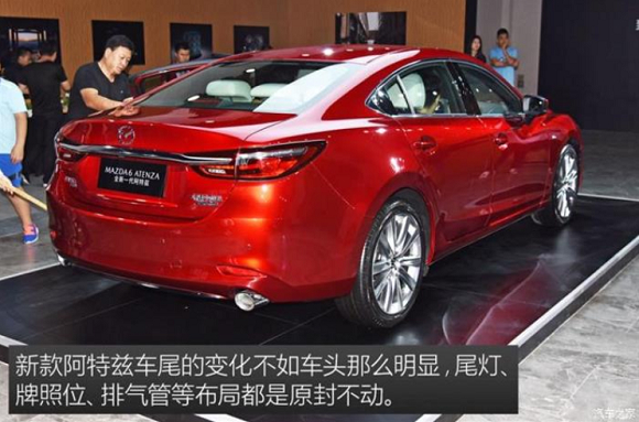 新款阿特兹的长/宽/高分别为4870/1840/1451mm,具有2830mm的轴距。虽然车身尺寸数据于现款车型相比几乎没有变化,但这样的尺寸在中型车中仍具竞争力。根据目前得到的信息来看,根据配置不同这款车将会配备225/55 R17或225/45 R19尺寸的轮胎。另外,其实从整体来看,新款阿特兹的车尾设计变化不是很大,保持了现款车型的设计方案。