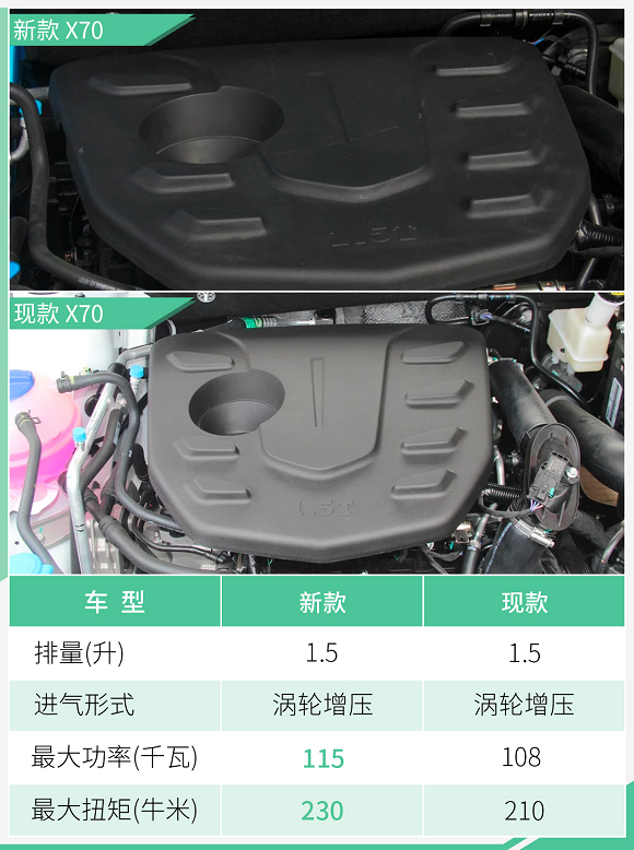 动力方面,新款X70搭载重新调校的1.5T涡轮增压发动机,最大功率提升至115千瓦;目前现款车型所搭载的1.5T发动机最大功率108千瓦。通过对比后可以看出,全新1.5T发动机在功率输出方面小幅提升。传动系统方面,匹配6速手动与6速双离合变速箱。