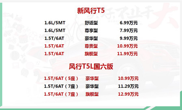 今年8月,东风风行推出了新风行T5/T5L,其主要面向三至六线市场。8月18日,网通社从东风风行官方获悉,新风行T5/T5L正式上市,其中新风行T5推出5款车型,官方指导售价为6.99-11.99万元;风行T5L国六版推出3款车型,官方指导售价为10.99-12.99万元。