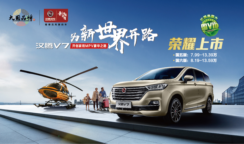 2019年7月23日,汉腾汽车旗下首款“中高端家用豪华MPV”——汉腾V7正式上市。新车同步上市国五版及国六b版车型,其中国五版汉腾V7官方指导价为7.99万元至13.39万元;国六b版汉腾V7官方指导价为8.19万元至13.59万元。