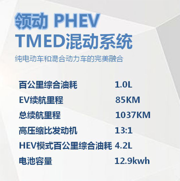 动力方面,新车搭载1.6L发动机+电动机组成的插电式混合动力系统。发动机最大功率105马力,综合油耗申报值为1L/100km,其纯电动续航里程为85km。