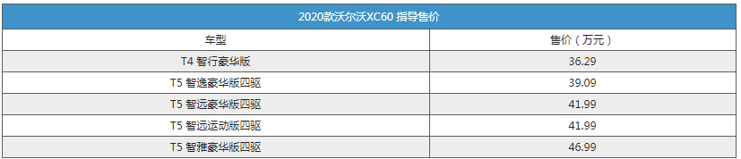 日前,我们从官方获悉,2020款沃尔沃XC60(参数|询价)正式上市,新车共推出5款车型,指导价格区间为36.29-46.99万元。详情请见下表: